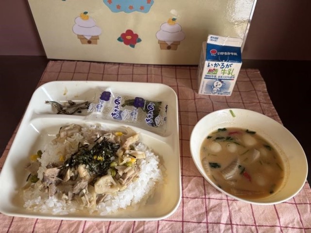 3学期初めの給食は、正月の行事献立でした。れんこんのちらしずし、牛乳、ぞう煮、ごまめ