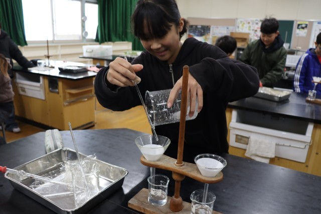 今日は、食塩とミョウバンの水溶液をろ過し、それらを冷やしてつぶを取り出せるのか?という実験をしました。子どもたちは、協力してろ過をし、氷水にビーカーを入れました。すると、ミョウバンのビーカーには変化が起こりました。子どもたちは、「つぶが出てきた!」「予想が当たった!」と嬉しそうに実験をしていました。