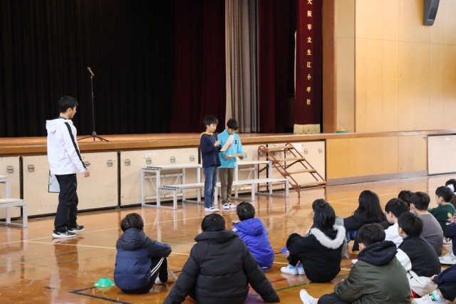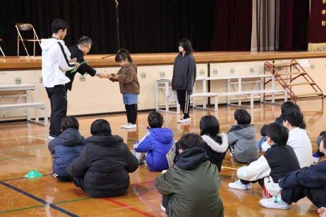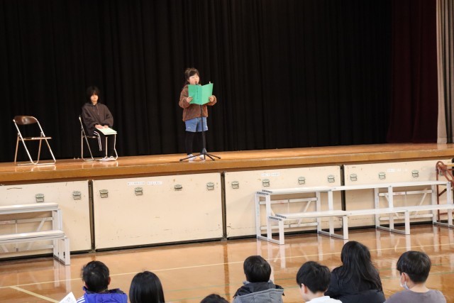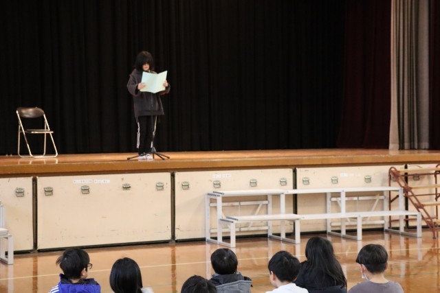 1年生の児童のテーマはがんばりたいこと、5年生は国語教科書の弱いロボットは必要だと思うという意見を発表しました。
