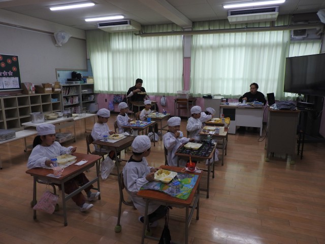 1年生のお祝いメニューで、今日はカツカレーでした。「おいしい」という1年生。「何がおいしい?」と聞くと「かつ」と答えていました。