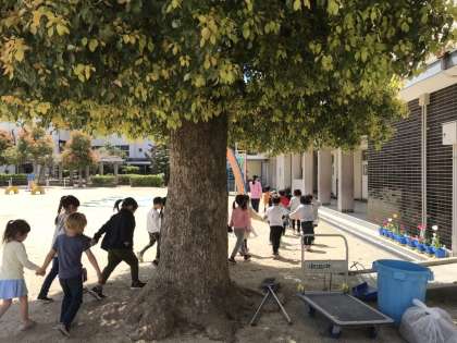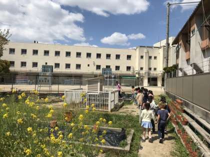 「きれいなお花!」「チューリップだ」「大きな花やな!」「黄色の花の名前は何だろう?」友だちと楽しくおしゃべりをしながら、花いっぱいの城北小学校をたんけんしました。