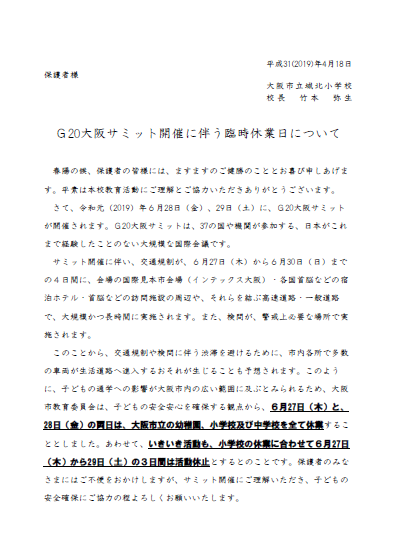 G20大阪サミット開催に伴う臨時休業日について 4月18日(木)