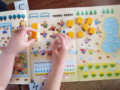 「ねずみと同じ数の動物や物はありますか?」と聞くと、子どもたちは真剣な表情でブロックを置きながら同じ数の仲間探しをしていました。