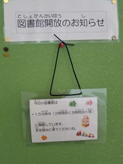 5月より、15分休みの時間に図書館を開放しています。職員室前とくすのき図書館前に、図書館開放についてのお知らせを掲示しています。