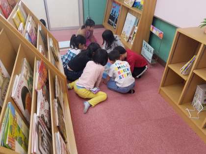 くすのき図書館では1年生が集まって大型絵本を読んで楽しんでいました。