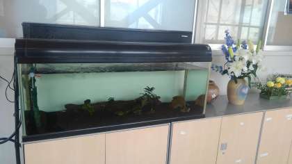 家庭訪問期間中に水槽をピカピカになるまで掃除をしました。先日の苔だらけだった様子からは見違えるほど、水はきれいに透き通っています。