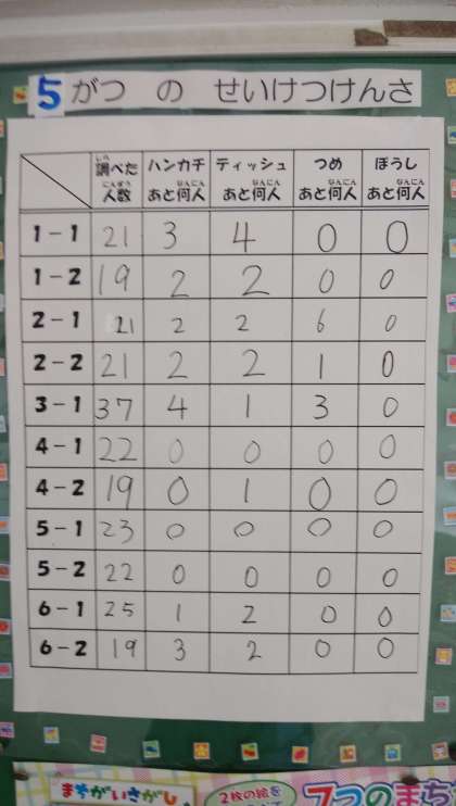 5月のせいけつ検査は、4年1組・5年1組・5年2組がパーフェクトでした。