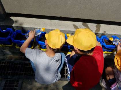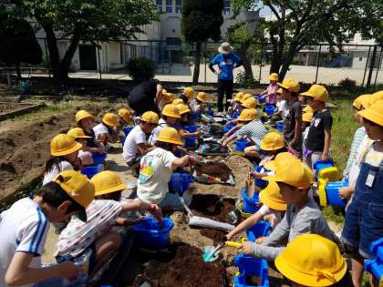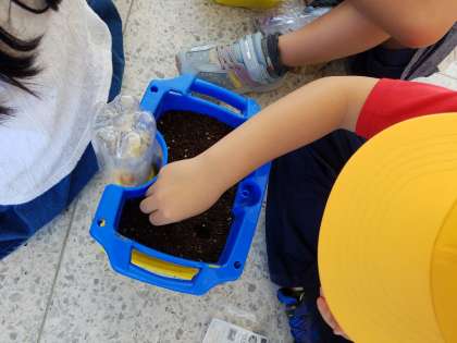 スコップを使って植木鉢に土を入れた後、指で穴をあけて種をまきます。「大きくなってね」「ピンク色の花が咲いてね」「青色の花がいいな」最後に水やりをしながら、子どもたちはお話をしていました。