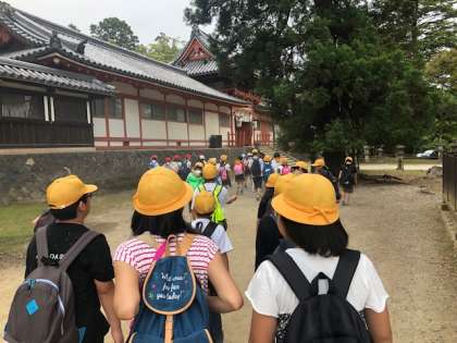 オリエンテーリングで班ごとに、二月堂から次のチェックポイントに移動しています。