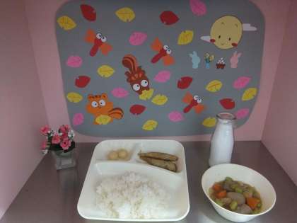 城北小学校では、9月4日に「月見の行事献立」がでました。内容は、里芋を使った「鶏肉とさといもの煮物」、白玉だんごを使った「みたらしだんご」でした。