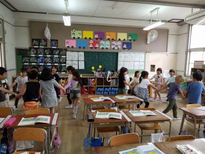 手をつないで輪になって、拍にのって右へ歩き、歌詞に合わせて開いたり閉じたりします。楽しく活動をすると、だんだん歌声も大きくなっていきました。