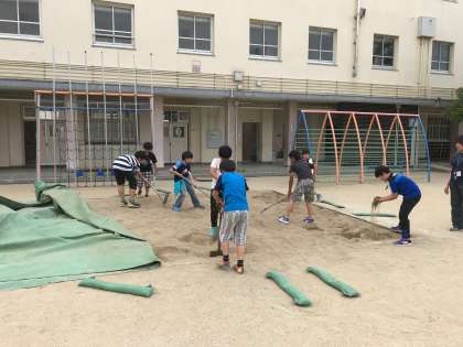 今日の活動では、来週からの体力テストに向けて幅跳び用の砂場の整地を行いました。