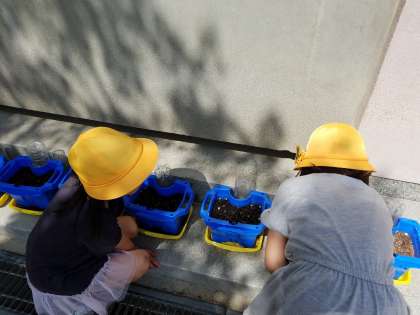 朝一番に「先生、芽が出てる!」と元気よく教えてくれました。さすが!毎朝欠かさず水やりをして、植木鉢を見ていた子どもたちです。