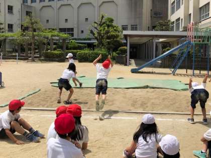 子どもたちは跳ぶタイミングを取ることが難しく感じながらも、大きく手を振り遠くへ跳べるように工夫する姿がありました。