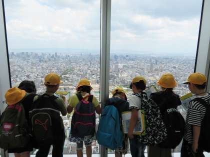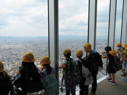 あべのハルカスからのまちの様子では、「北に高いビルが多いこと」や「南や西には山々が連なっていること」などに気づいた子どもたちがいました。