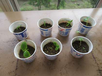 ゴールデンウィーク明けにまいた種(ホウセンカとマリーゴールド)が、芽をだし、葉をだし始めました。