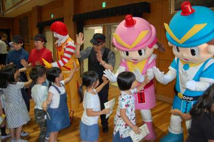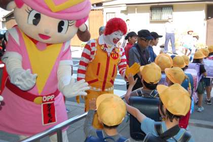 教室へ帰る際や下校時には見守り活動として、大阪府警マスコットキャラクターのフーくんとケイちゃん、ドナルドが正門前で見送りをしてくれました。