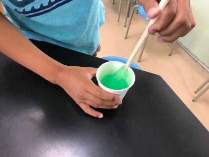 自分で選んだ絵具で色水を作り、洗濯のり、ホウ砂を分量に気を付けながら混ぜました。