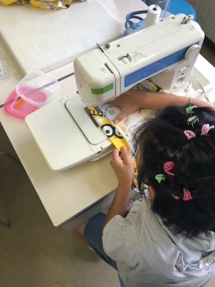 エプロンの布地の端を三つ折りにし、アイロンで折り目をつけてミシンで縫っていきました。ミシンやアイロンの使い方にも慣れてきました。