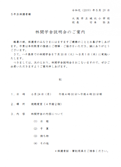 また、林間学舎への参加希望の確認をさせていただきますので、「林間学舎参加申込みについて」の申込書にご記入の上、6月5日(水)までに担任へご提出ください。