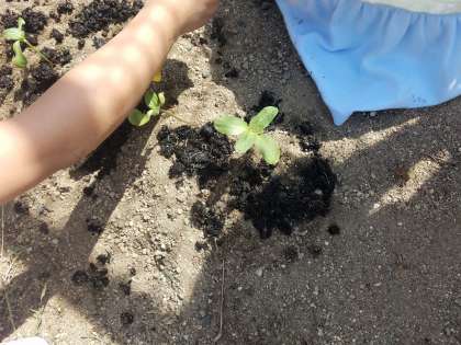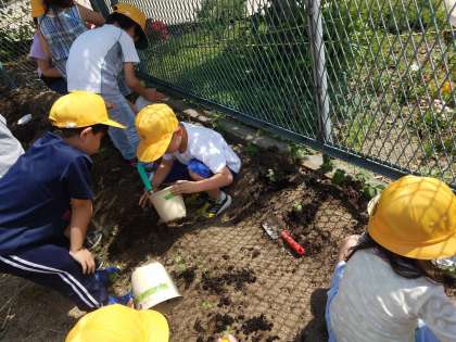 先日、植木鉢に植えたヒマワリの種が発芽し、本葉を出しました。さらに、大きく育つように、学習園への植え替えを行いました。