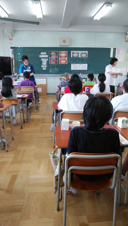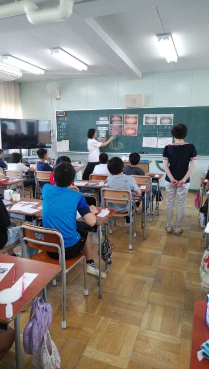 今日は、学校歯科医の岩本先生、歯科衛生士の平中先生に、6年生の「歯・口の健康教室」を行っていただきました。