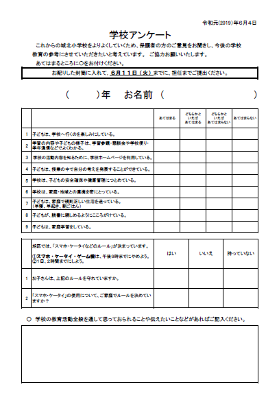 城北小学校をよりよくしていくため、保護者の方のご意見をお聞きし、今後の学校教育の参考にさせていただきたいと考えています。ご協力お願いいたします。