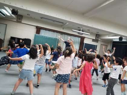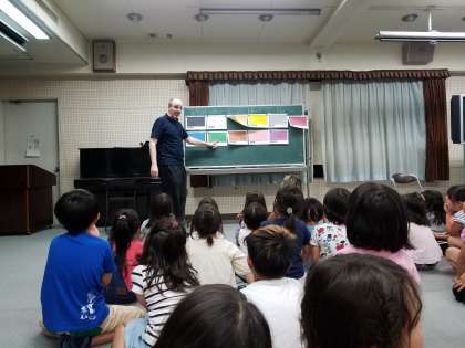 英語の指示で体を動かすゲームをしたり、好きな色を聞く英語を話してみたりしました。
