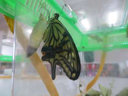 朝、アゲハチョウがさなぎからせい虫になりました。子どもたちは、とても貴重な瞬間を観察できました。