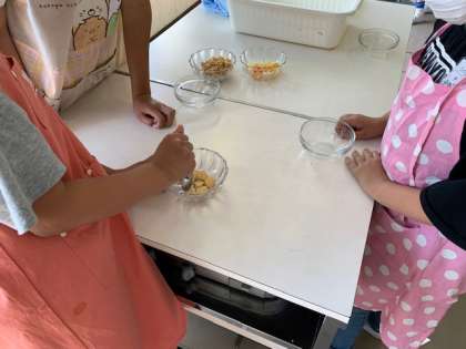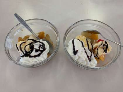 今日は、みんなで暑い季節にぴったりの「パフェ作り」をしました。2回目の調理だったので、準備や片付けの手際もよく楽しく活動することができました。どの班も協力して、おいしそうなパフェを作ることができました。