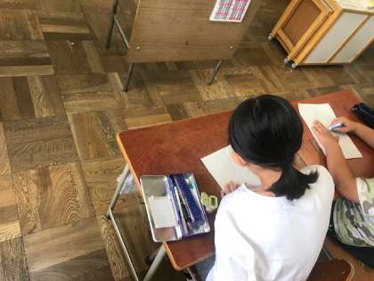 夏をテーマに、夏で連想されるものは何があるかを出し合って、自分が切り絵にしたい題材を見つけて描きだしました。