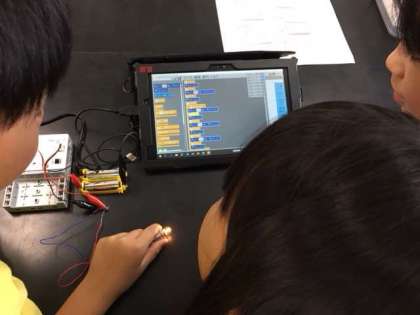 『プログラミングで、豆電球の明るさを変えてみよう』や『プログラミングで、電気を節約しよう』という授業のめあてをもとに、2回の理科の学習に渡って、実際にプログラミングを体験しました。