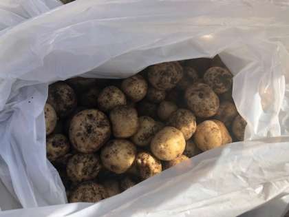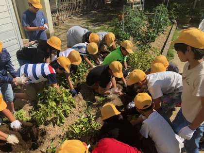 土を掘ると、たくさんのジャガイモを収穫することができました。収穫した重さをみんなで予想しました。子どもたちは4kg〜14kgまで様々な意見が出ました。正解は明日発表します。
