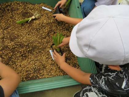 3時間目に、地域や区役所の方々のご協力のもと、花しょうぶについて勉強しながら、植え替え体験をしました。