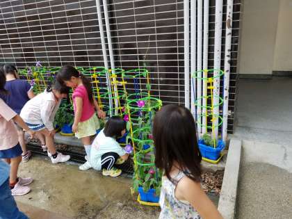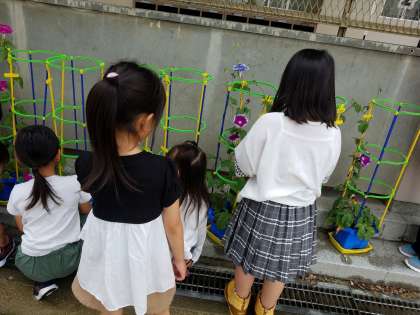 「わあ!きれいな色!」「先生、5こも咲いていたよ」と嬉しそうに報告したり、「まだ咲かないけど、つるが伸びてきたよ」「これはつぼみかな?」とじっくり観察したりと、子どもたちはアサガオを大事に育てています。