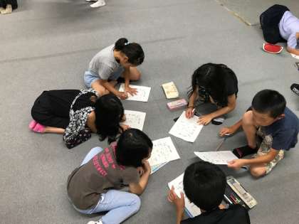 防災マップ作りに向けて役割決めを行いました。消火器や消火栓、送水口など探検に行った際に簡単にメモが取れるように、班でマークを決めました。