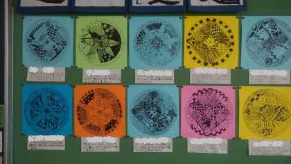 下がきをせず、ペン一本で様々な種類の模様を組み合わせてつくりました。それぞれの世界観をもって味わい深い作品に仕上がりました。