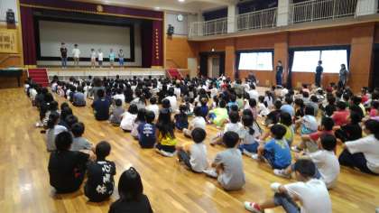 舞台上の集会委員の児童が、「り」「ん」「ご」などの言葉を一文字ずつ複数同時に言って、それをたてわり班で協力して聞き取り、何という言葉かを当てるゲームです。