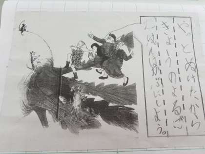 今日は、かぶを引っ張っているときと、かぶが抜けたときの登場人物の気持ちを考えました。吹き出しに言葉を入れてお話をつくる学習は、大好きな子が多く、いつも盛り上がっています。