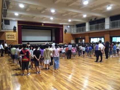 校長先生の話、生活指導の先生より夏休み中のくらし方について話がありました。最後は、元気よく校歌を歌いました。