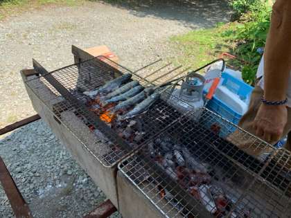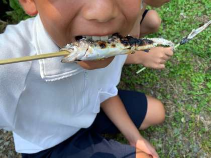 苦労して捕まえた魚は、その場で焼いてもらっていただきます。普段の生活では味わえない体験に、みんなとても楽しそうです!