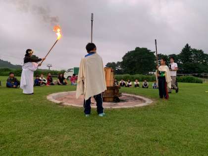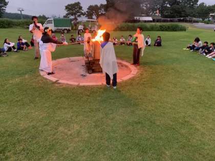 火の神様の登場です。「友情の火」「信頼の火」「希望の火」を分けてもらいました。次は火を囲みながら、歌を歌ったりゲームをしたりして友情を深めていきます。