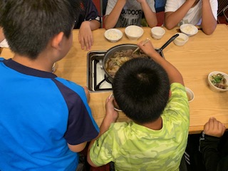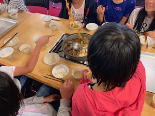 2日目の夕食はすき焼きです。大好きなお肉を前にみんな大喜びです。