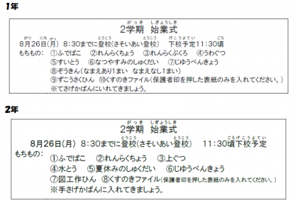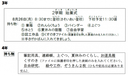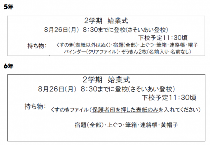 来週から2学期が始まりますが、準備は整っているでしょうか。よいスタートをきるために、始業式の持ち物を確認して忘れ物のないように声かけをお願いします。