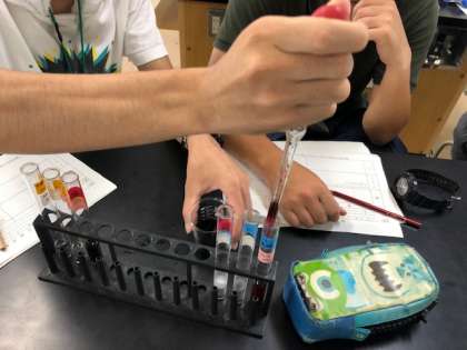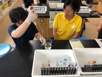今回は、主に6年の単元で使用する塩酸や水酸化ナトリウムの実験用の液体を作る際の調整の仕方や、実際に性質を調べる実験をグループに分かれて行いました。