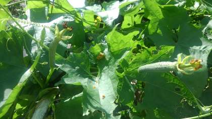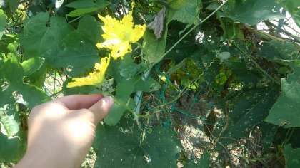 残念ながら5年生が育てていたカボチャは花が咲いていなかったので、4年生のヘチマを見せてもらいました。教科書に載っている通りに、おばなの茎の辺りにはたくさんのつぼみが、めばなは受粉が終わって実が大きくなり始めている様子がよく分かりました。