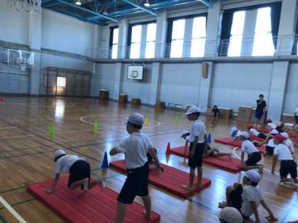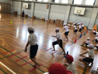 始めはカエル跳び・スキップなどの運動をした後、しっぽ取りゲームを行い、それから実際に走り方の練習をしていきました。どんどんステップアップしていく運動に、子どもたちのやる気もぐんぐん上がり、最後のリレーではどのチームも接戦で盛り上がりました。運動会が楽しみです。