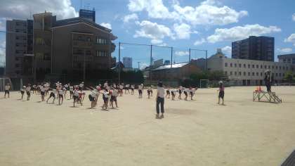 団体演技は「ソーラン節」を練習しています。今日は運動場に出て、基本の踊りと隊形移動を確認しました。