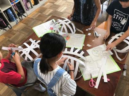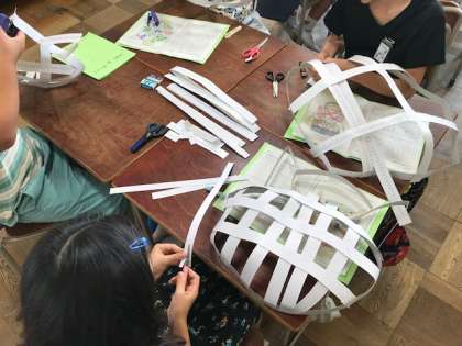 設計図をもとにお面の製作が始まりました。ボール紙を骨組みにして、ホッチキスで止めながらお面の型を作っていきます。設計図通りにかたどることが難しく、子どもたちは苦戦していました。