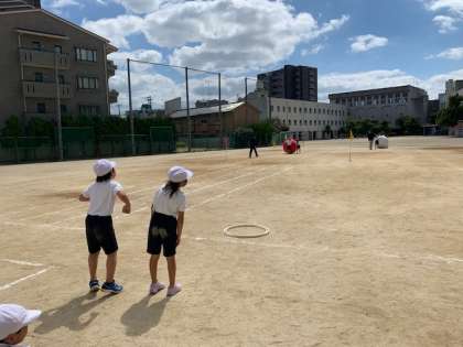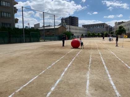 運動場で初めて大玉ころがしの練習をしました。どうしたらコーンの周りを素早く回ることができるのかを考えて練習しました。初めての練習でしたが、上手に次の人に大玉を渡すことができていました。